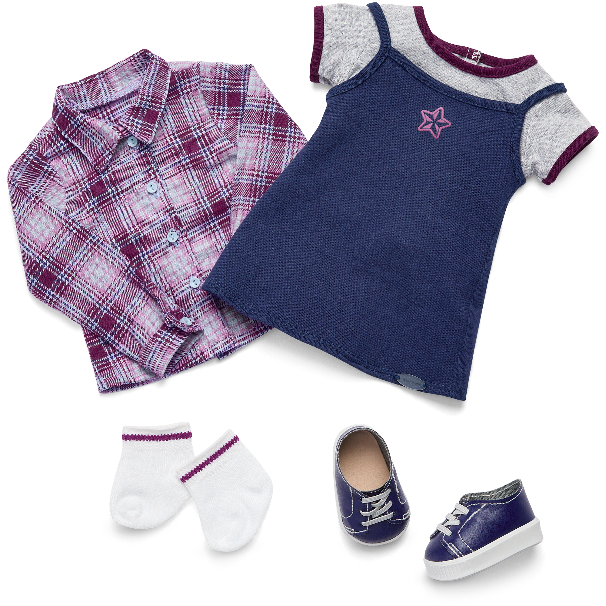 Nicki 18-inch Doll & Journal: The 18” Nicki doll has blue eyes that open and close, and long brown hair with face-framing layers and front blonde highlights. She has a soft cotton body, and her movable head and limbs are made of smooth vinyl. Nicki arrives wearing a gray T-shirt with purple binding, a T-shirt dress with a star graphic on the front, a plaid flannel shirt, ankle socks, platform sneakers, and cotton underwear. She includes the Nicki: My Journal paperback book.