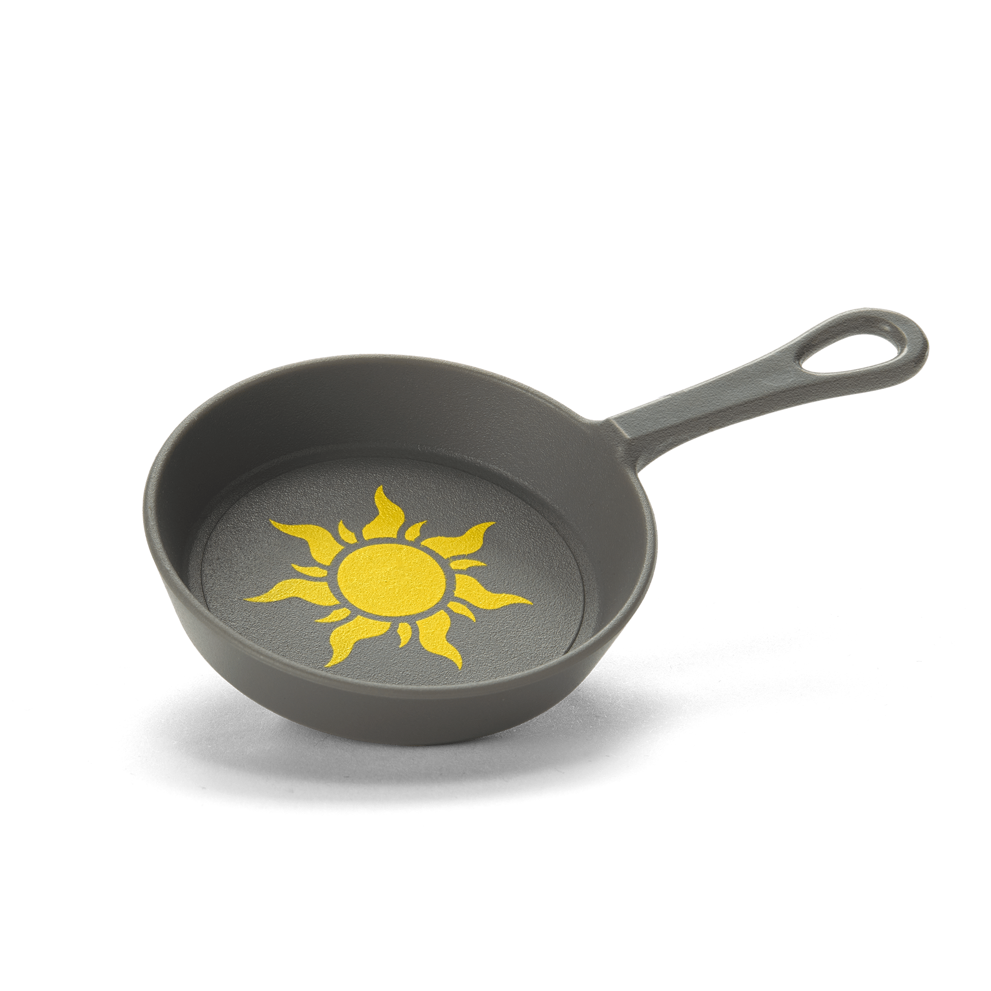 A gray frying pan Rapunzel can hold, featuring a sun icon detail