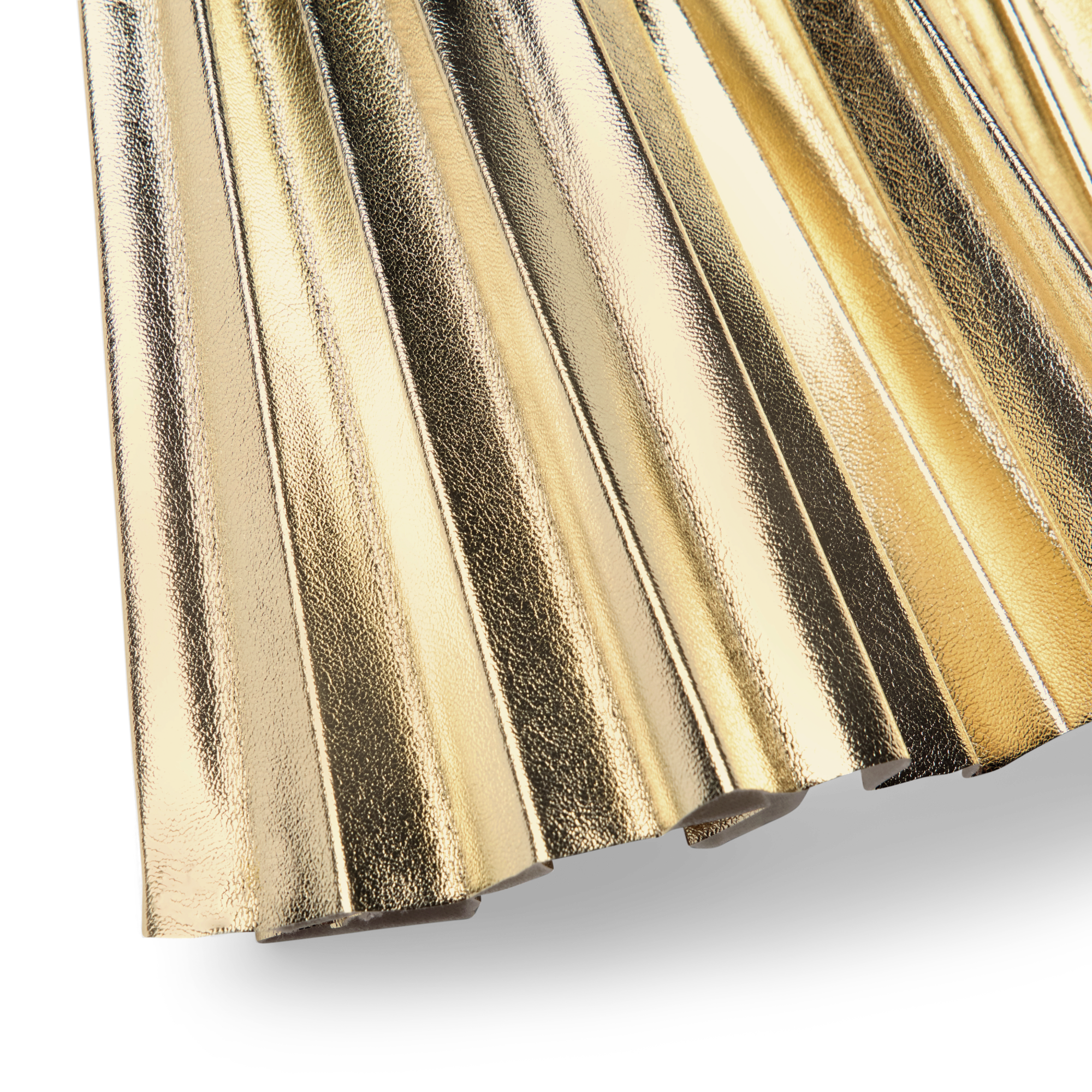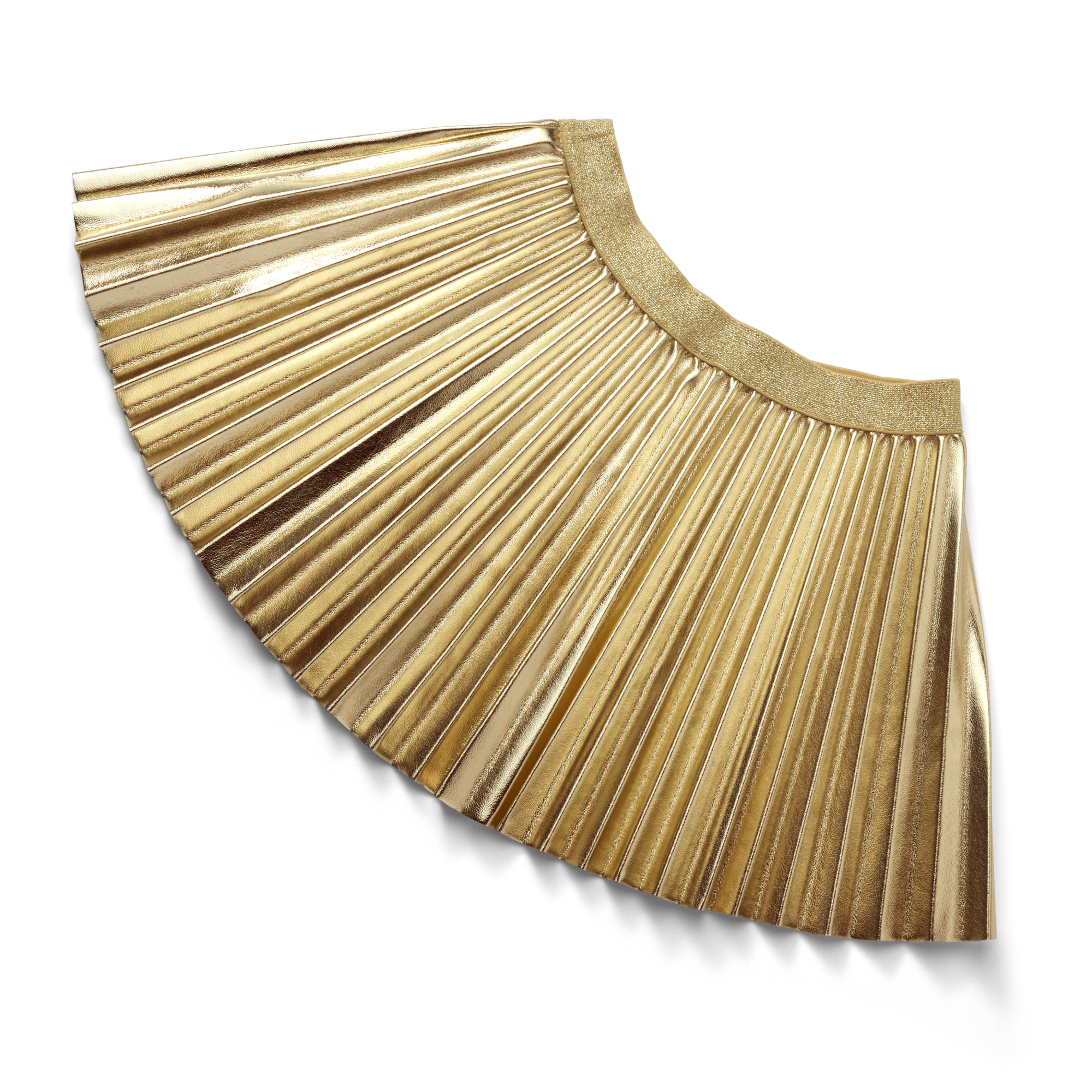 A pleated golden metallic faux-leather skirt with an elastic waistband