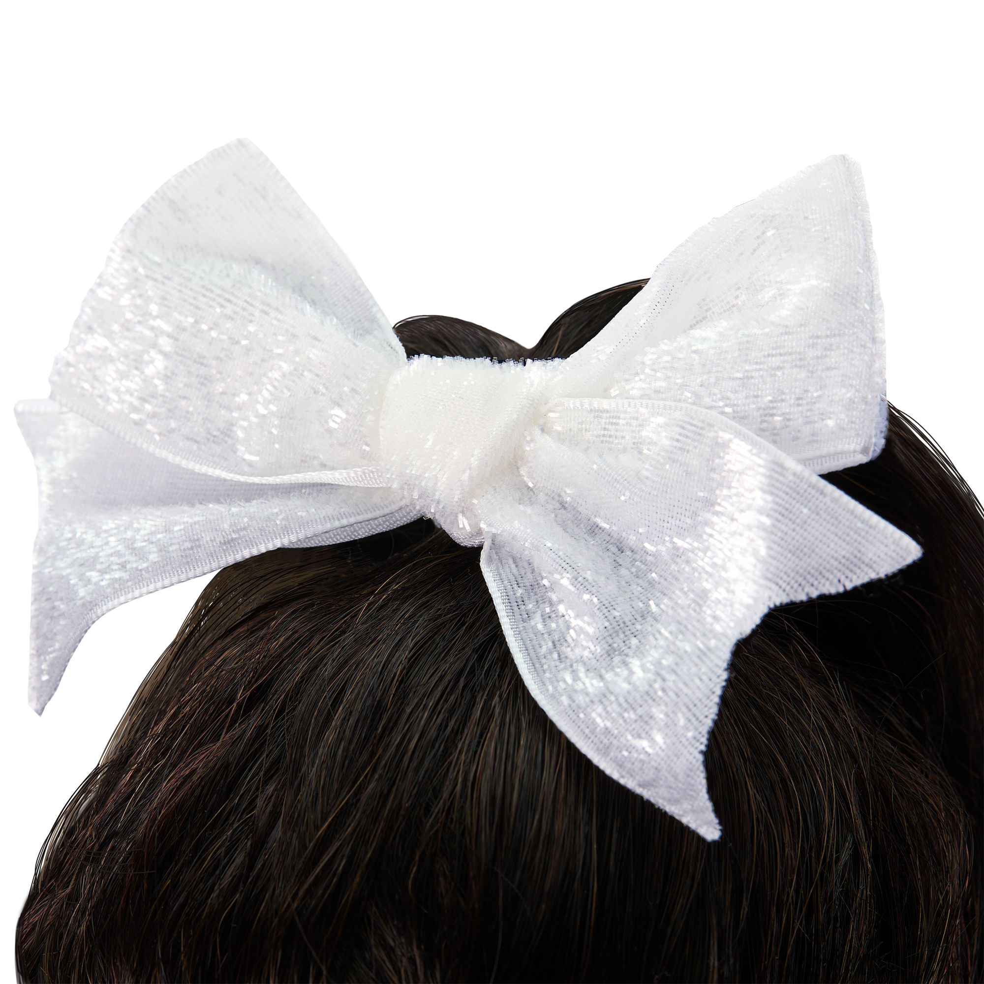 A large glitter hairbow and a set of white pom-poms dolls can hold
