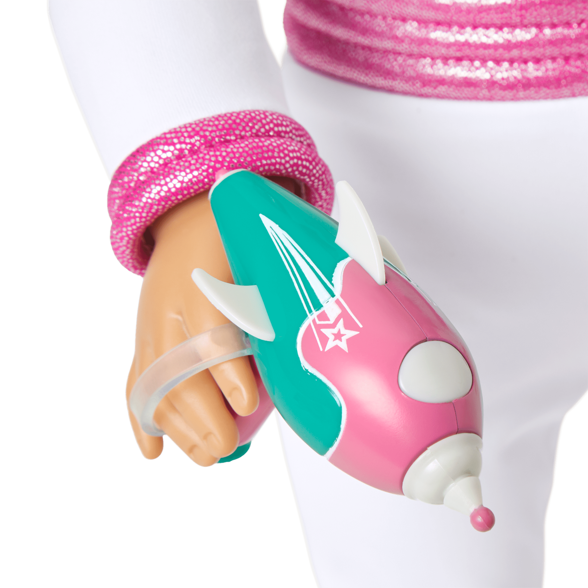 A white zip-front bodysuit with sparkly-pink puffy accents and a Crystal Starshooter logo on the chest