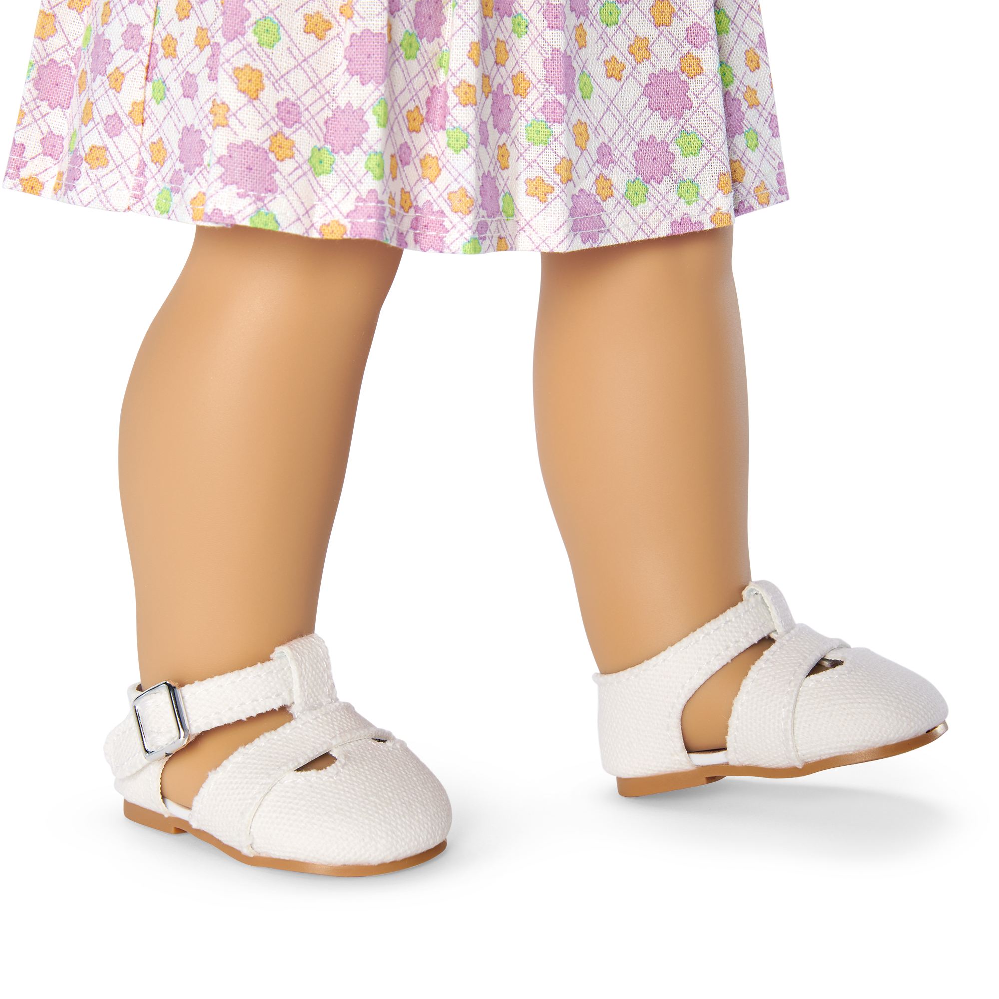 An 18″ Kit doll that matches the original doll from 2000. She has blue eyes that open and close, a sprinkling of freckles across her nose, and a neat blonde bob styled with a green diamond-shaped barrette. She has a soft cotton body, and her movable head and limbs are made of smooth vinyl.