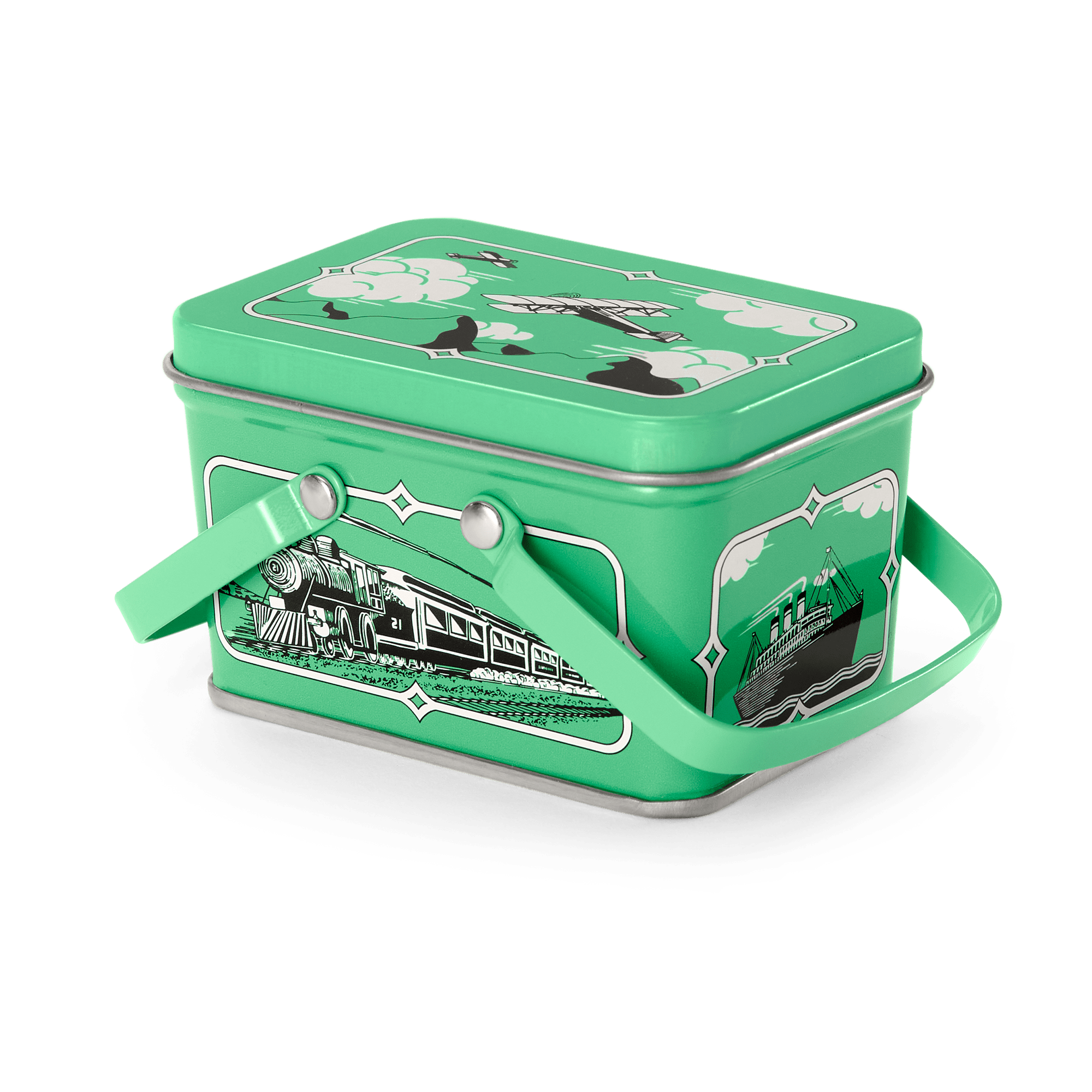 A light-green tin lunch box with two handles and a removable lid. The lid and sides feature black-and-white artwork depicting ships, trains, and airplanes