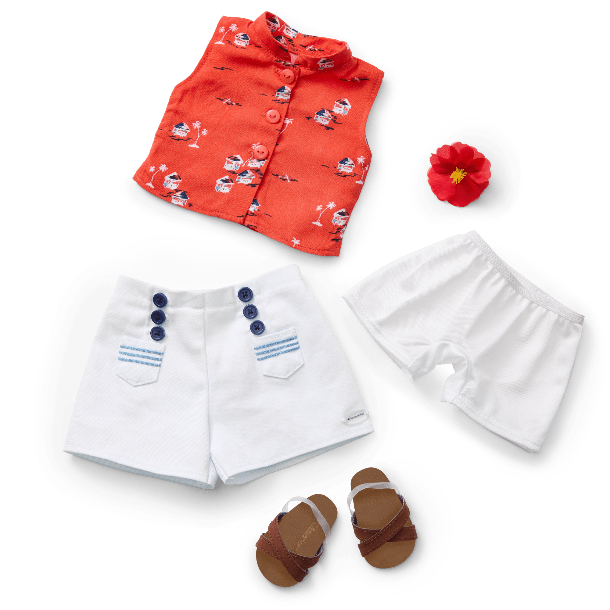 Kindhearted Nanea Mitchell has big, lifelike hazel eyes that open and close smoothly, and realistic wavy dark-brown hair styled with a red faux-hibiscus hair clip. She comes in an authentic 1940s-style outfit: