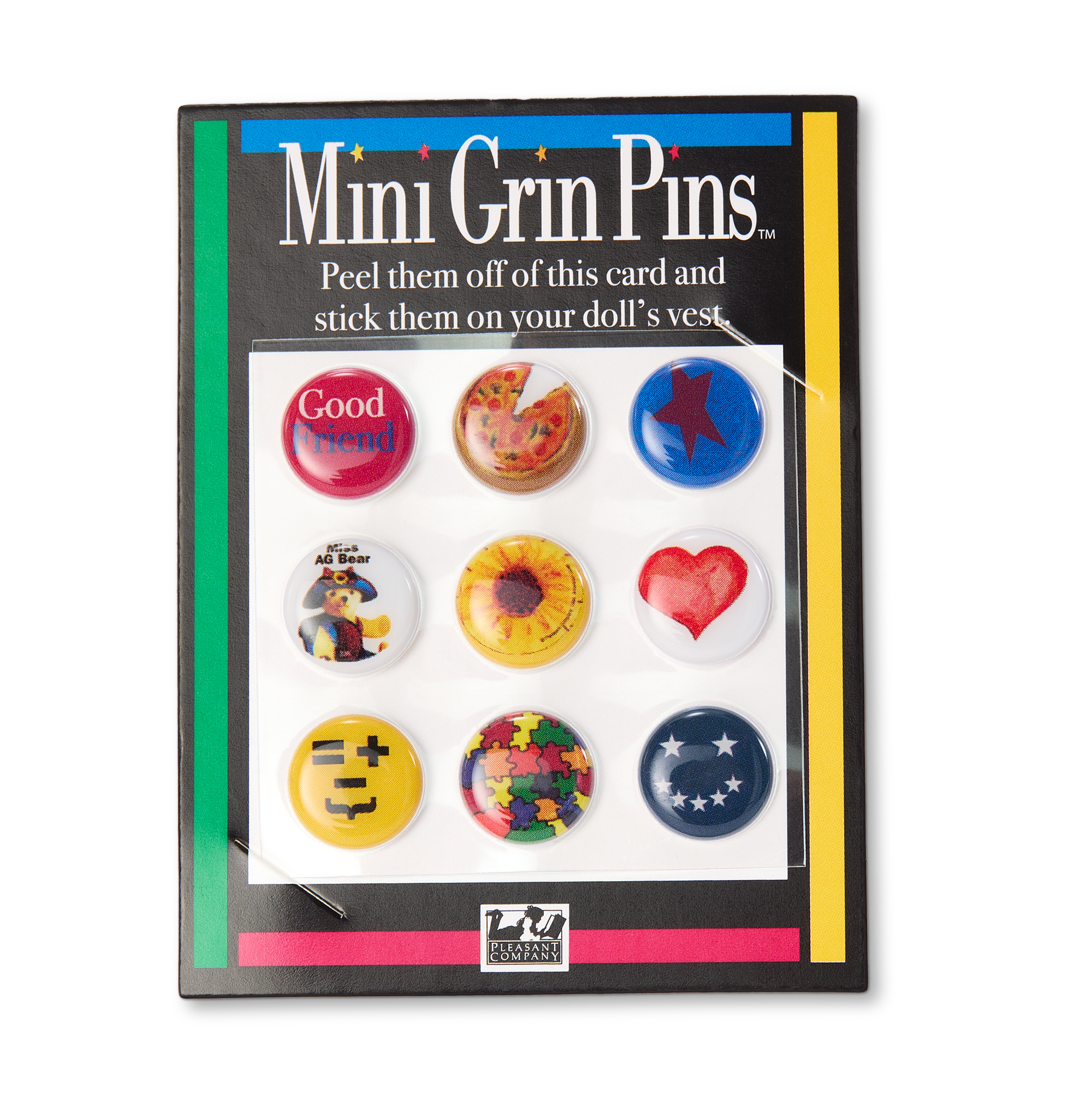 Nicki’s Accessories for 18-inch Dolls: A baseball hat with faux mini American Girl Today Grin Pins, sunglasses, a ribbon necklace with a yin-yang pendant, a messenger bag, a notebook, and American Girl Today Grin Pin stickers