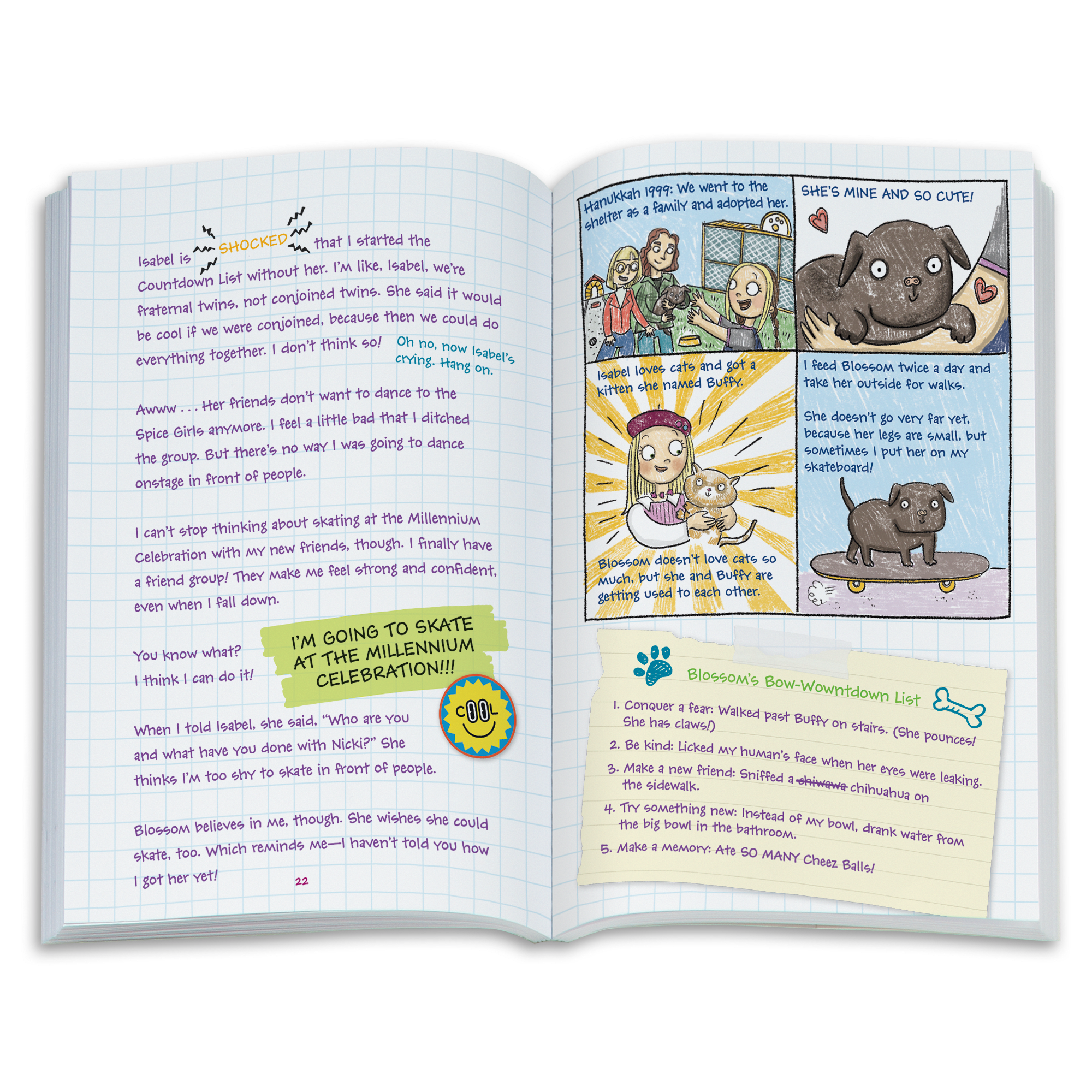 Growing up in Seattle in the late 1990s, Nicki loves alternative rock music, skateboarding, and making zines, which are like homemade magazines. She couldn’t be more different from her twin sister, Isabel, but they’re still best friends. Nicki’s favorite accessories showcase her unique style, and she keeps them close at hand.