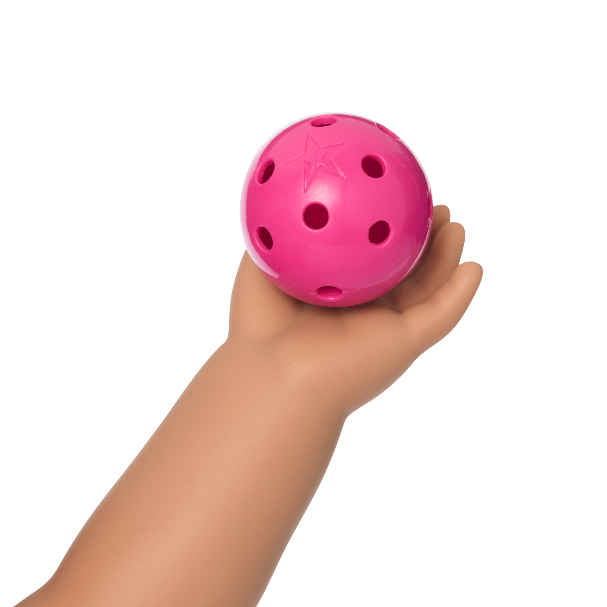 Raquel’s Pickleball Bag & Paddle Set for 18-inch Dolls:A pair of pickleball paddles dolls can hold; a pickleball bag with a front zipper pocket that can hold the racket; three pink pickleballs; a water bottle; and a teal visor with a transparent pink bill and an embroidered AG logo