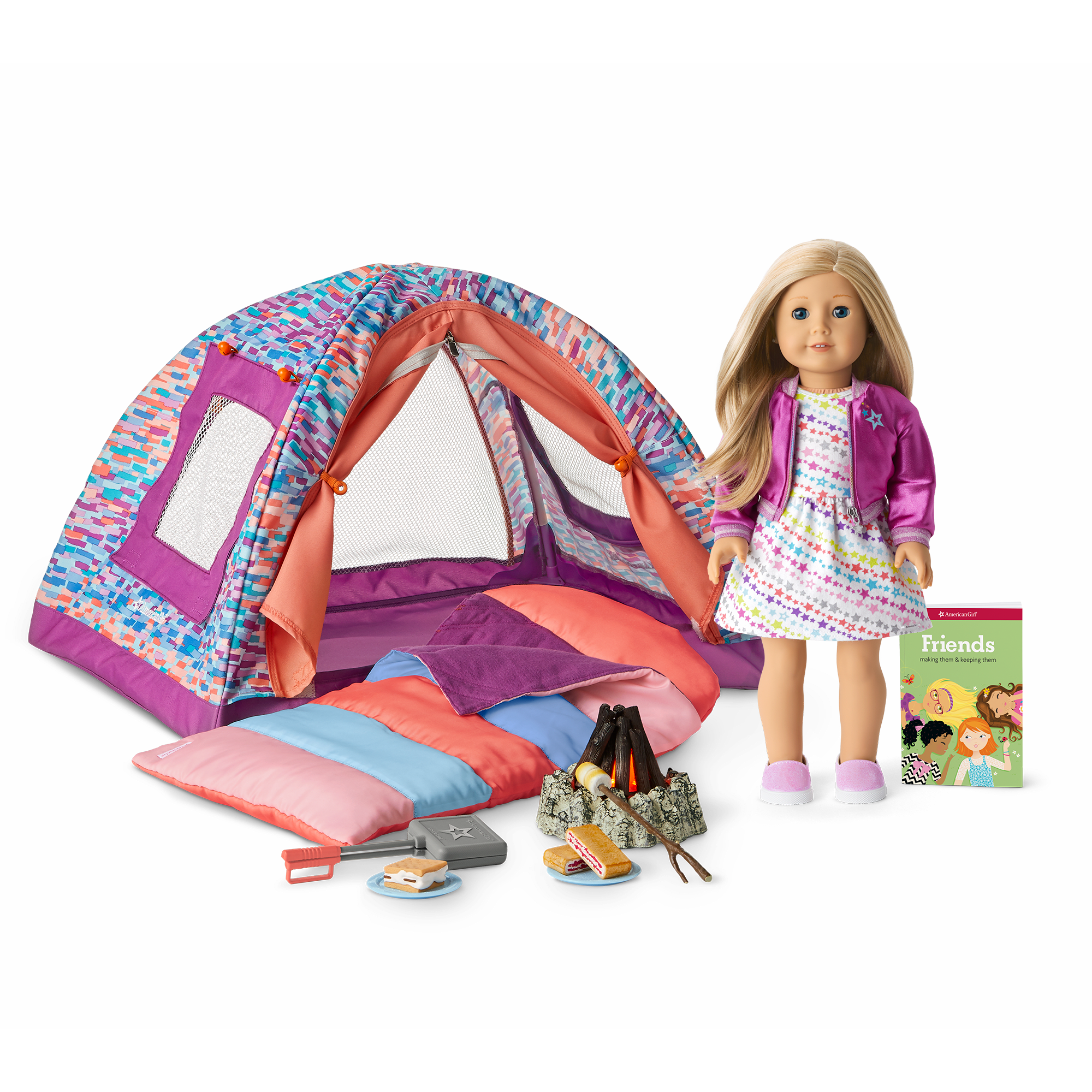 S’more Fun Camping Set for 18-inch Dolls: A tent, sleeping bag, a campfire that lights up and makes crackling sounds, a pie iron and pie, a s’more, a marshmallow-roasting stick, and two plates.
